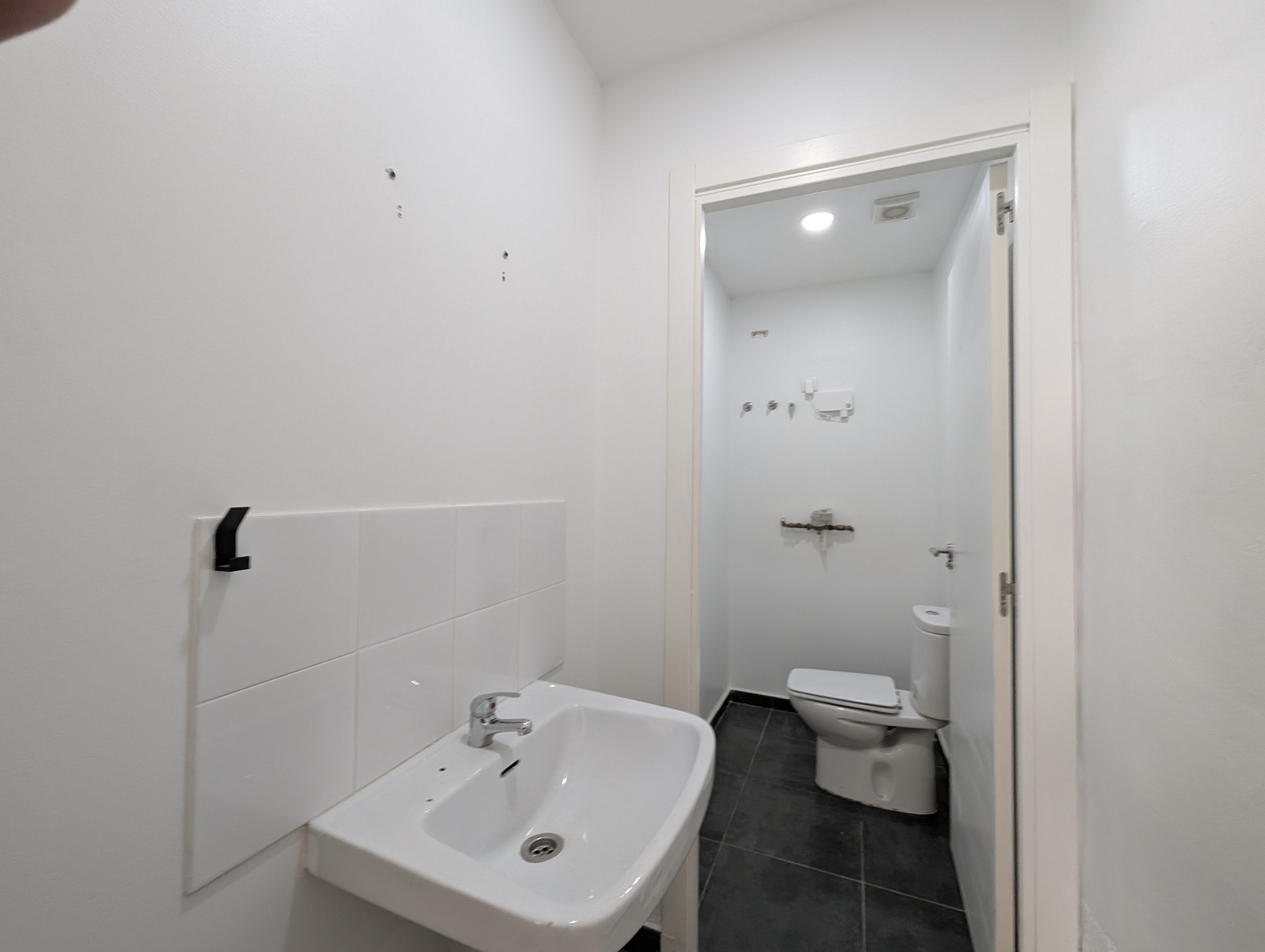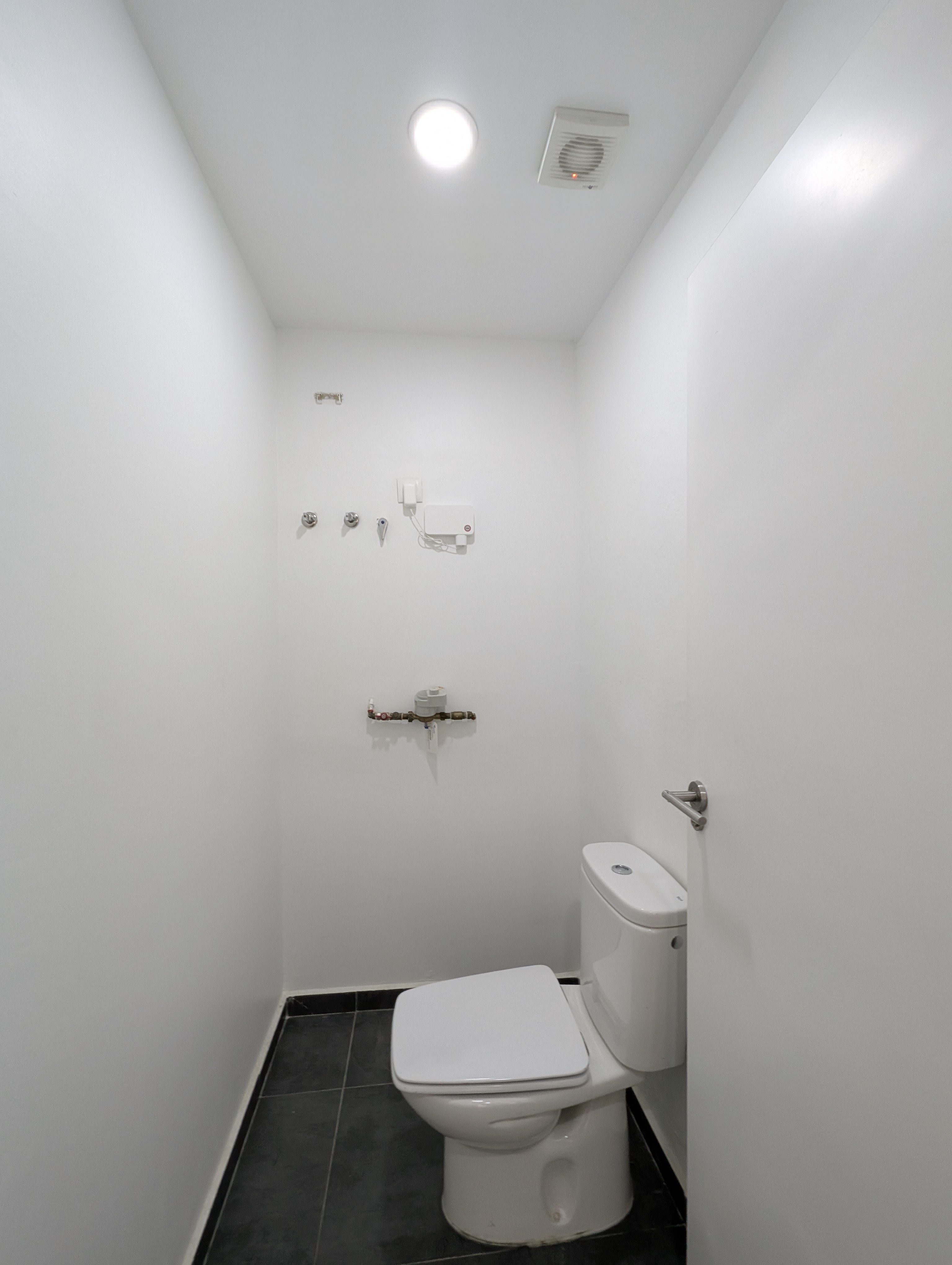 Espacio de aseo cerrado, biombo separador de obra de estancias, iluminación con discos de LED.